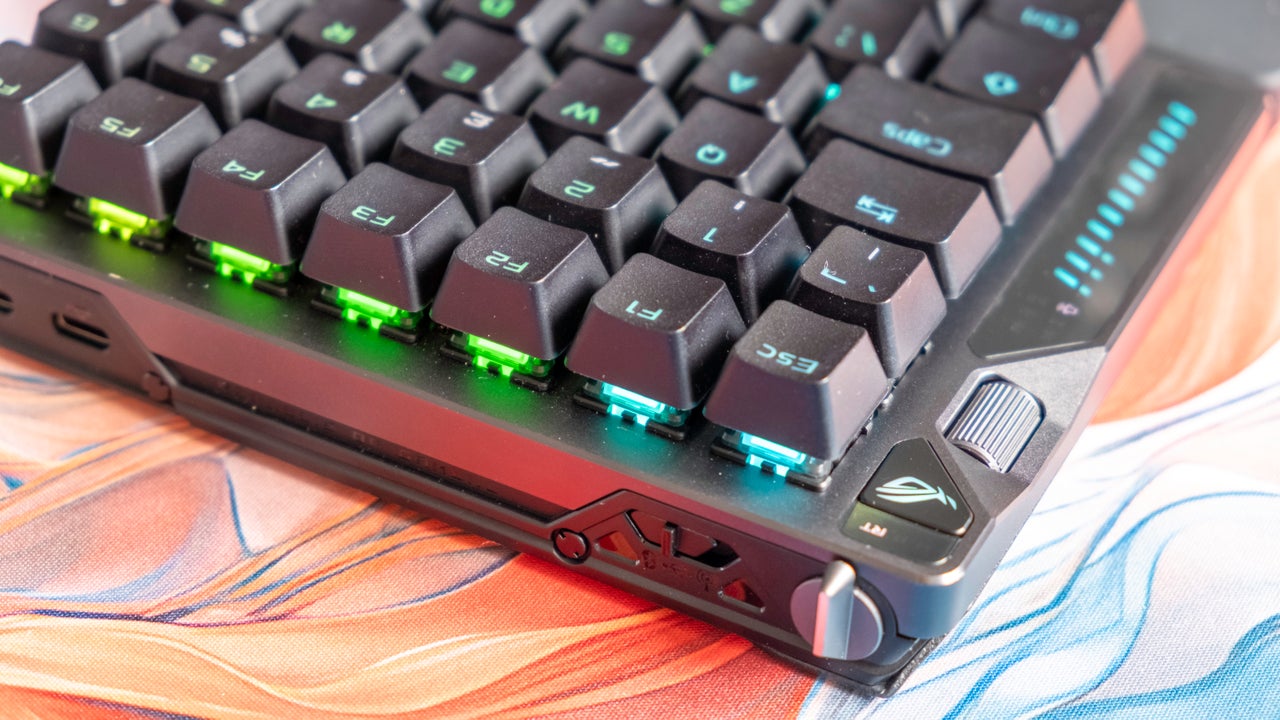 Το ROG Falcata είναι ένα πληκτρολόγιο 75% που αποτελείται από δύο μισά, συνδεδεμένα με ένα καλώδιο USB-C. Κάθε μισό διαθέτει ενσωματωμένο μαξιλάρι παλάμης, προσδίδοντας στο σύνολο μια τετράγωνη όψη, αν και αυτά μπορούν να αφαιρεθούν. Η σχεδίαση είναι σχετικά κοινή, με πλήκτρα λειτουργιών στο πάνω μέρος, βέλη στη δεξιά κάτω γωνία και έναν τροχό έντασης στην άνω αριστερή γωνία. Η μοναδική λωρίδα φωτισμού LED δείχνει τη ρύθμιση της έντασης και της φωτεινότητας του πληκτρολογίου, προσφέροντας χρήσιμες πληροφορίες.